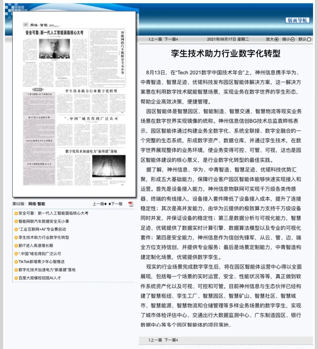 8月12日,由神州控股、BB贝博艾弗森官网、bb贝博艾弗森集团联合主办的“科技自强、数据融通、场景创新——TECH数字中国 2021技术年会”云上盛大启幕,发布神州信创云、ModelB@nk5.0、金融超脑Sm@rtFSB、云原生数字化安全底座、园区智能体等重磅产品,国内各大权威、影响力媒体多角度多频次对盛况进行报道!