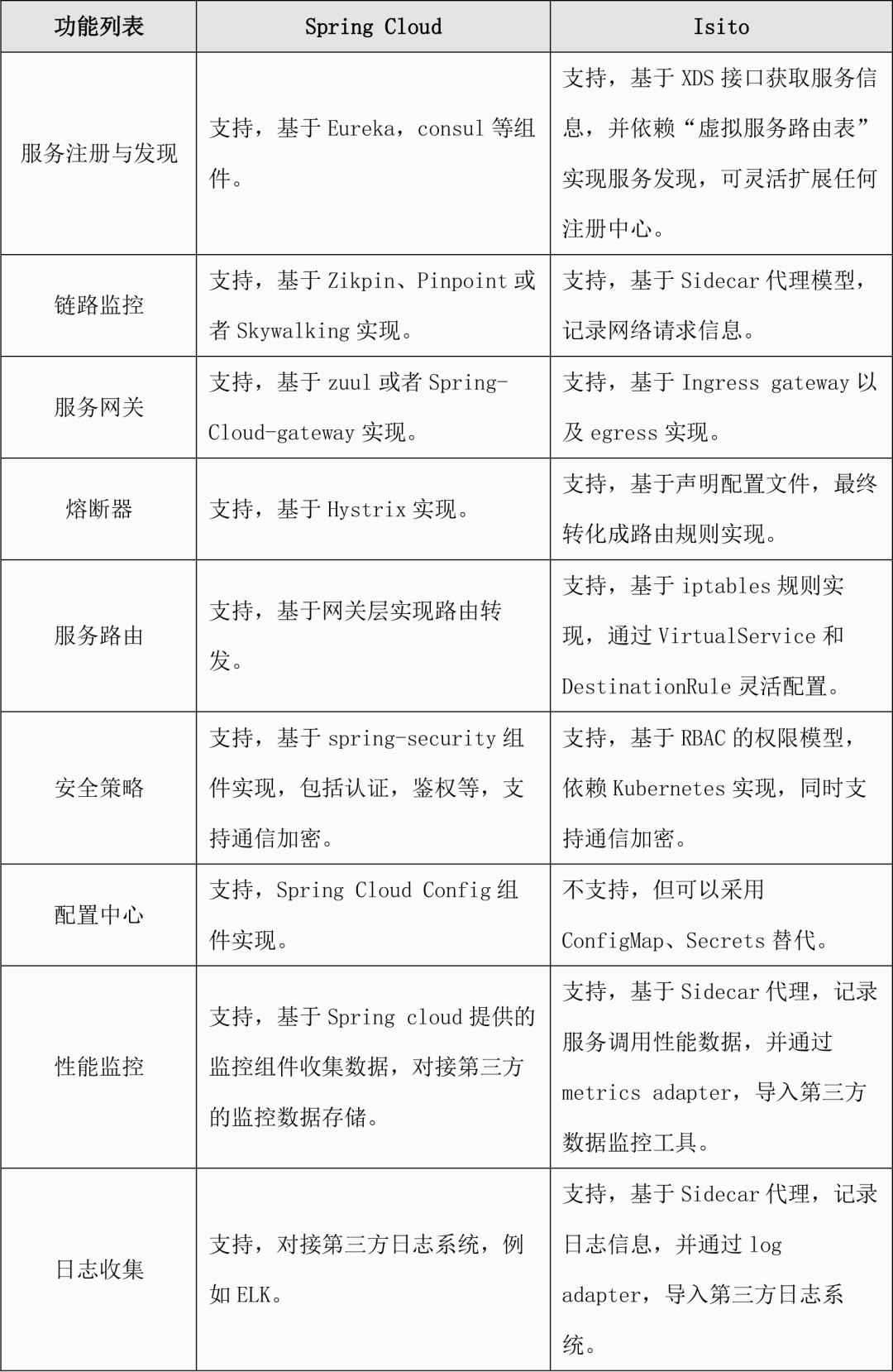 上述Spring Cloud的功能在 Istio 框架上都能找到对应的功能,并通过适当的资源清单配置即可完成。