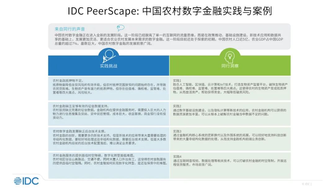 在本次《IDC PeerScape:中国农村数字金融实践与案例》研究报告中,为了了解中国农村数字金融的最新探索与发展方向,IDC对多家金融机构与创新企业进行访谈,总结出最新的实践成果和创新方向,为业界提供参考。