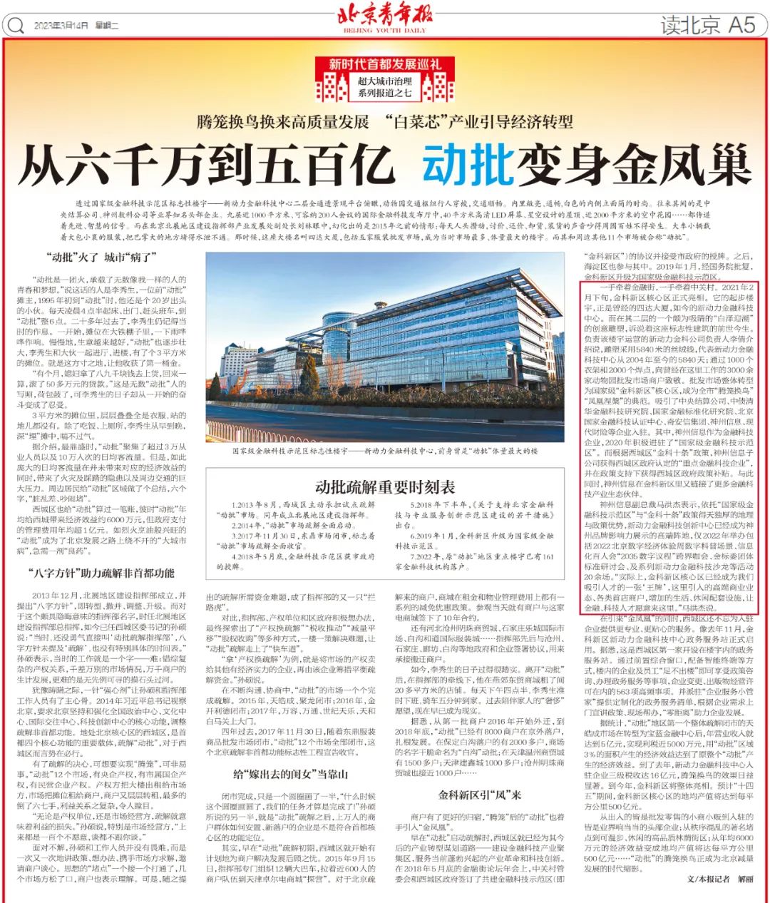 据统计,“动批”地区第一个整体疏解闭市的天皓成市场在转型为宝蓝金融中心后,年营业收入就达到5亿元,实现利税近5000万元,用“动批”区域3%的面积产生的经济效益达到了原整个“动批”产生的经济效益。到了去年,新动力金融科技中心入驻企业三级税收达16亿元,腾笼换鸟的效果日益显著。到今年,金科新区将整体亮相。预计“十四五”期间,金科新区核心区的地均产值将达到每平方公里500亿元。