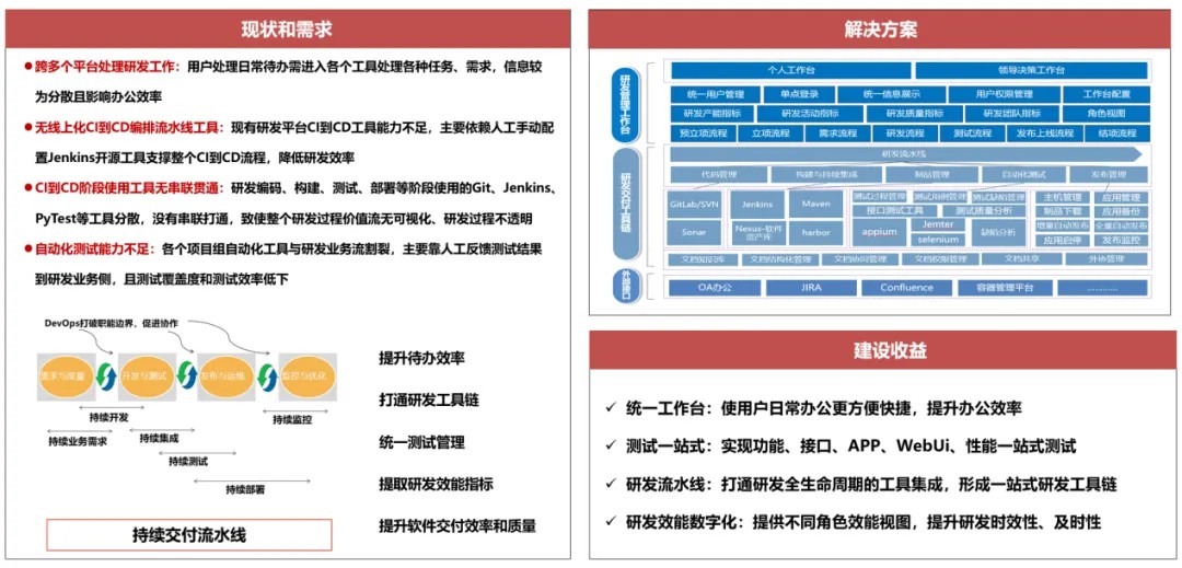 ● 一体化工作流:整合了需求、开发、测试、部署等环节,实现研发过程的无缝衔接。