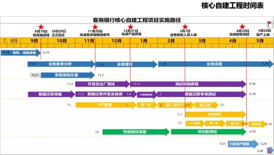 2021年5月28日15:00,刘元庆行长正式发布投产上线指令。核心自建工程项目组在5月28日18:00至5月31日08:00的投产窗口内完成50个系统的投产上线和业务切换,共发布554条投产指令,执行182个绿灯测试和796个试营业案例。经过5月31日和6月1日两个工作日的验证,柜面、智能网点、电子网银各渠道业务办理正常,系统运行稳定,实现了从托管系统到自建系统的完美过渡。
